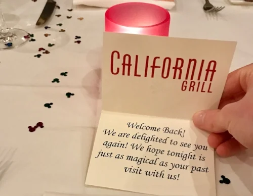 Another favorite is California Grill, located in the Contemporary Resort. This restaurant is a favorite for many reasons including excellent food and a great atmosphere. What makes this restaurant truly unique is that the Magic Kingdom is visible from this 15th floor restaurant. If you dine during the time the nightly fireworks show occurs at the Magic Kingdom, you’re in for a treat! The entire restaurant’s lights are dimmed, the audio from the show is piped into the restaurant and you can view the fireworks show from your table or walk out to the balcony to get a great view. They also include little touches like notes and confetti on your table that make the experience a little more special!